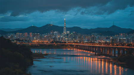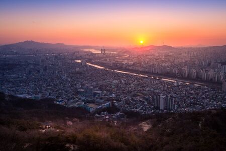 Cityscape night view of Seoul, South Korea at sunset time