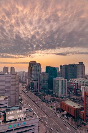 SEOUL, KOREA - MARCH, 2019: Sunset view of office buildings and traffic in Songpa-gu, Seoul