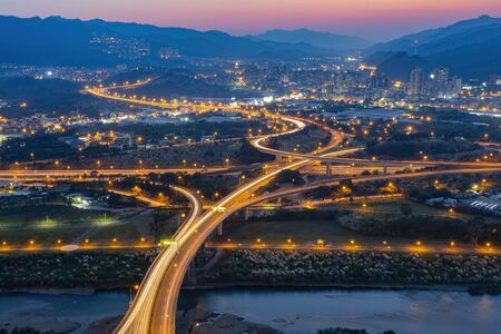 Night aerial shot of the New Taipei City cityscape at Taiwan