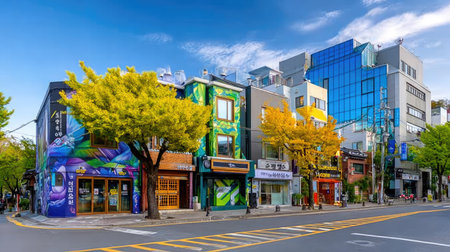A lively urban street scene showcasing vibrant buildings adorned with art, bordered by beautiful autumn trees beneath a bright blue sky, depicting city life.