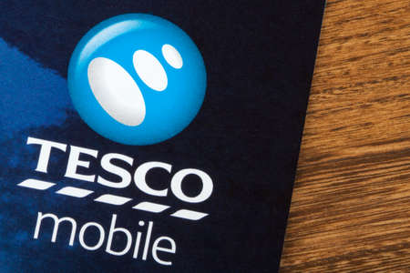 LONDON, UK - JUNE 13TH 2016: A close-up of the Tesco Mobile logo on a promotional leaflet, on 13th June 2016.