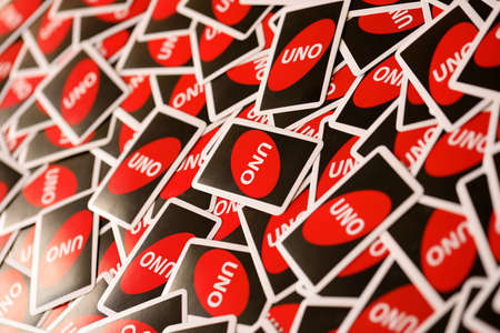 TERNOPIL, UKRAINE - MAY 15, 2022: Many colorful UNO game cards. UNO is an American shedding-type card game that is played with a specially printed deck. UNO has been a Mattel brand since 1992