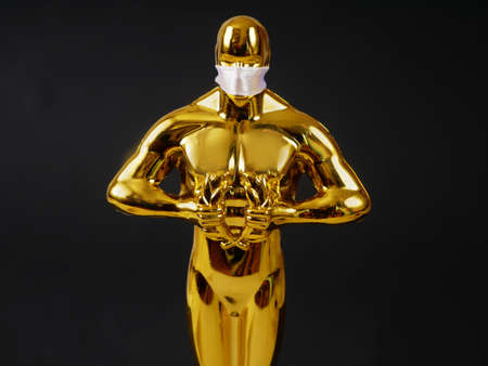 Hollywood Golden Oscar Academy award statue in medical mask. Success and victory concept. Oscar ceremony in coronavirus time