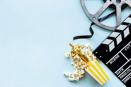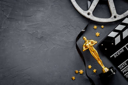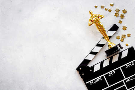 Movie clapper board with golden film award statue