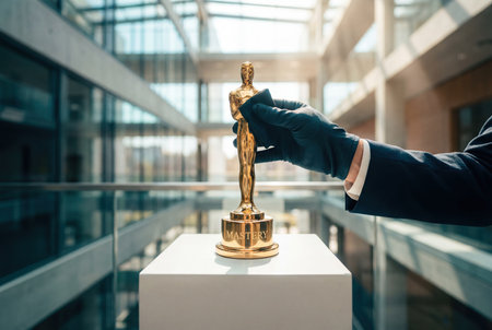 Movie and entertainment award held by someone wearing protective gloves