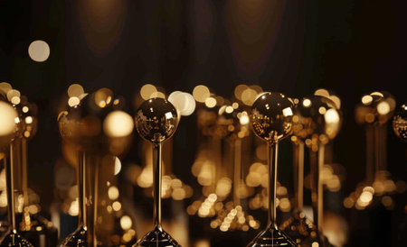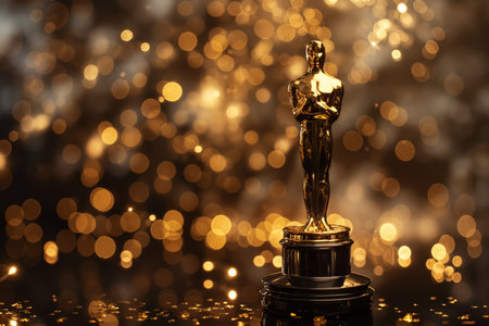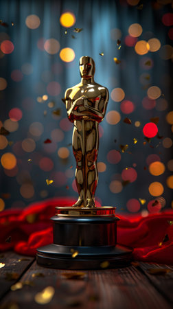 Golden trophy stands proudly on a red carpet, illuminated by beautiful bokeh lights, symbolizing achievement and recognition in the film industry.