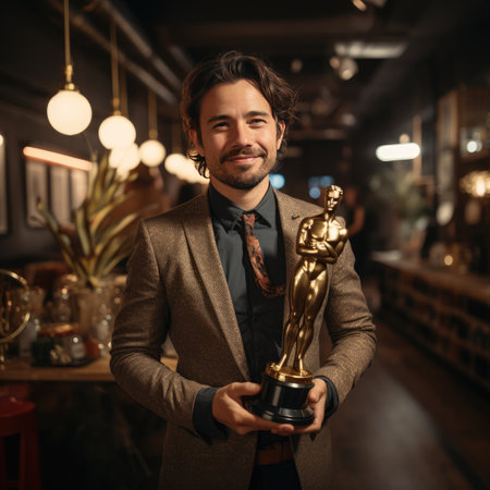 A man in a tuxedo holds a golden award statue