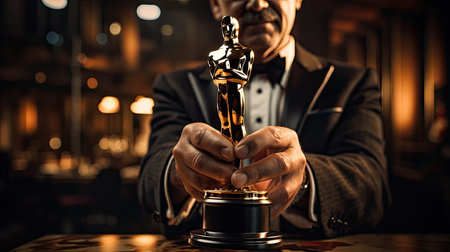 Man holding famous film award statue on the red carpet background, close-up view
