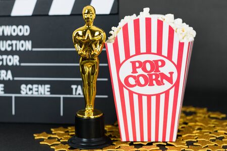 XALAPA, VERACRUZ, MEXICO- JANUARY 31, 2020: Classic popcorn box, clapboard, classic popcorn box and golden stars on black background