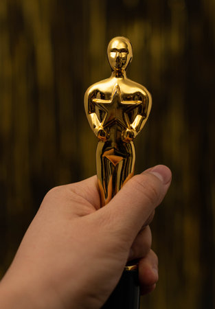 XALAPA, VERACRUZ, MEXICO- NOVEMBER 13, 2020: Woman hand holding a plastic Oscar award on golden and blurred background