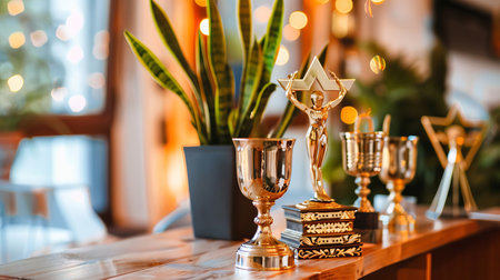 A beautifully arranged trophy display that symbolizes career development and achievement, perfect for capturing motivation and success in elegant settings.