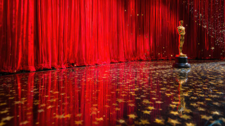 A solitary golden Oscar award statue stands proudly on a stage floor covered in confetti, with rich red curtains forming a dramatic backdrop.