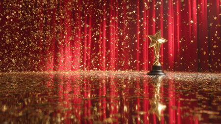 A golden star trophy stands on a reflective surface, with a red curtain backdrop and shimmering confetti falling.