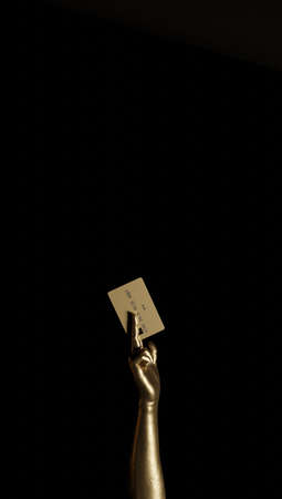 Female hand holding blank plastic credit card or business card on black isolated studio background. Banking services and acquaintance concept, copy space, cutout, low key. 3d rendering.