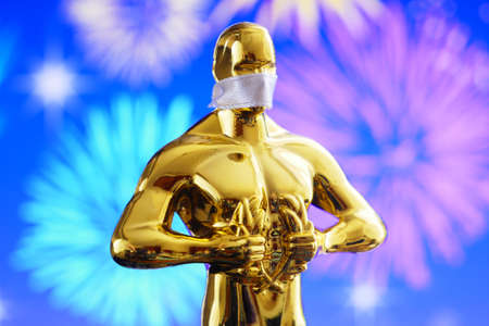 Hollywood Golden Oscar Academy award statue in medical mask. Success and victory concept. Oscar ceremony in coronavirus time