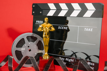 Golden trophy in shape of human figure, movie clapper and film reel on red background