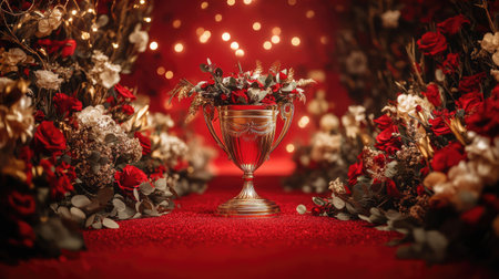 A golden trophy cup placed on a red carpet surrounded by elegant decorations and flowers.