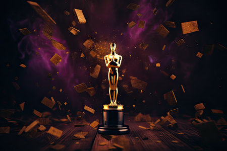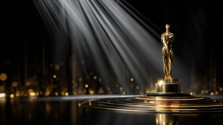 A golden statue of an Oscar award is on a pedestal. The statue is surrounded by a cityscape, with lights shining on it. Scene is celebratory and glamorous