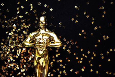 XALAPA, VERACRUZ, MEXICO- FEBRUARY 14, 2019: Plastic Oscar awards, a clapboard and golden stars confetti against black background