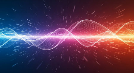 abstract background with blue and red wave lines and glowing particles.
