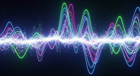 Vibrant abstract sound wave visualization featuring colorful peaks and troughs against a dark background, symbolizing sound frequency and energy. Ideal for technology, science, and multimedia themes.