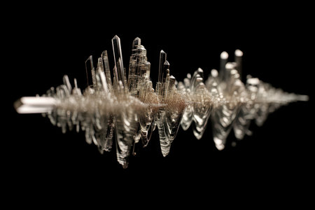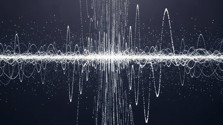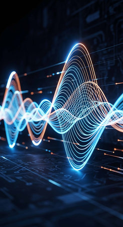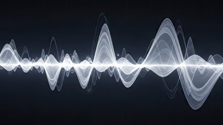 An illustration features a sound wave design with fluctuating white lines set against a dark backdrop. The composition shows dynamic forms suggesting sound or signal transmission. The image utilizes transparency and highlights the wave patterns, suitable for digital media, presentations, and educational resources.