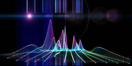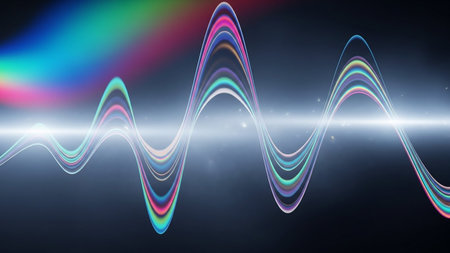 Vibrant abstract sound wave visualization featuring colorful peaks and troughs against a dark background, symbolizing sound frequency and energy. Ideal for technology, science, and multimedia themes.