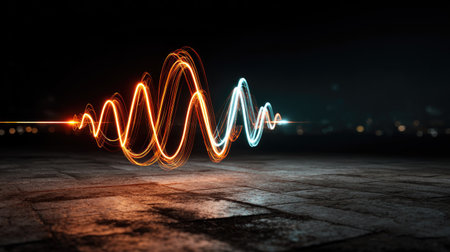 Glowing, wavy lines of energy against dark background, reflecting on a floor