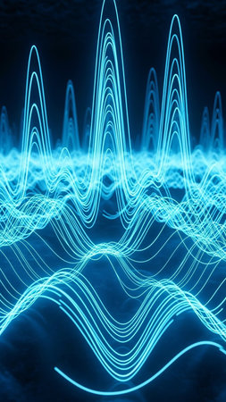 Curved digital waveform graph showing sharp peaks and smooth dips, glowing in a sci-fi blue hue.