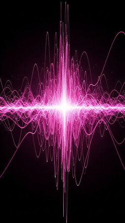 An abstract visualization features a vibrant, undulating waveform rendered with glowing lines against a dark backdrop. The composition showcases dynamic lines in shades of purple and red. This conceptual image may be suitable for illustrating themes related to sound, data, and technology in various digital contexts.