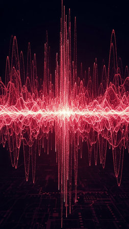 A dynamic, glowing red sound waveform pulsates vertically against a dark background, with a subtle digital circuit pattern visible at the base.
