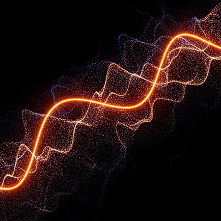 A vivid pulse line glows in warm orange tones, reflecting off a smooth surface, illustrating energy and rhythm in a dark setting.