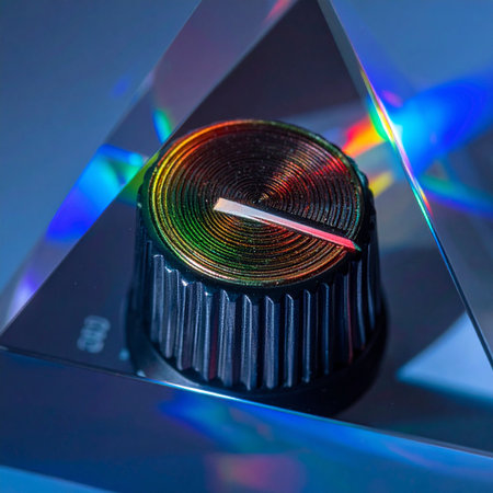 A single control knob, bathed in the refracted rainbow light of a prism, represents the precise adjustment of sound, frequency, and energy.
