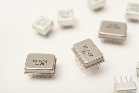 Old chips on a white background. Different electronic chips. Microcircuits in a metal case.
