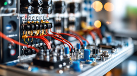 An electronic circuit board and various components are showcased, illuminated by a combination of red and blue light. The image highlights a complex arrangement of wires, panels, and equipment, indicating a possible laboratory or workshop setting. This composition may be suitable for illustrating technology, innovation, or research concepts in commercial contexts.