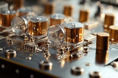 Detailed examination of a high-tech circuit board reveals an arrangement of gold-plated components, capacitors, and clear housing, highlighting modern electronics craftsmanship.