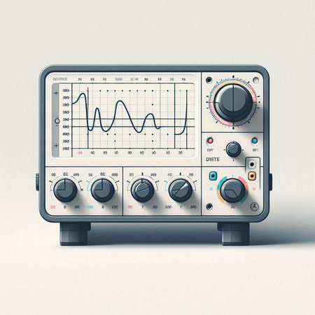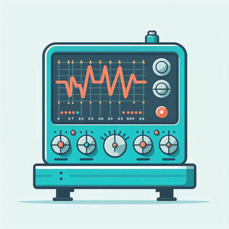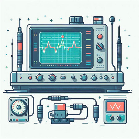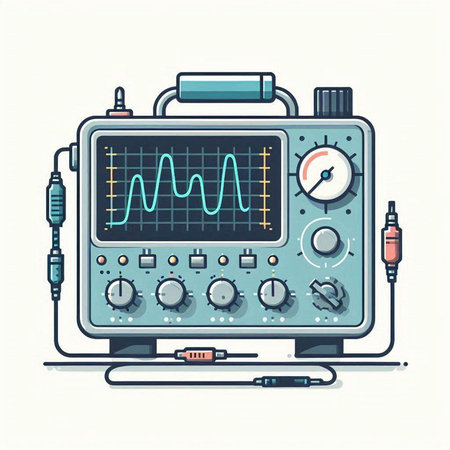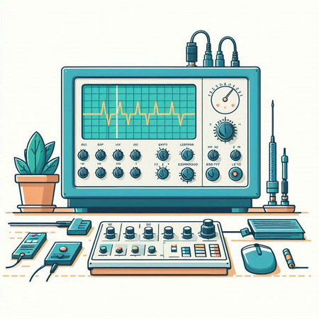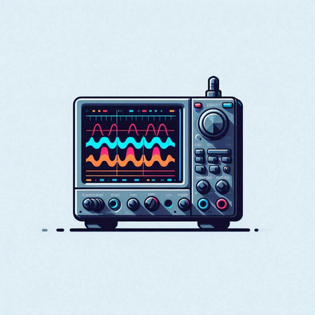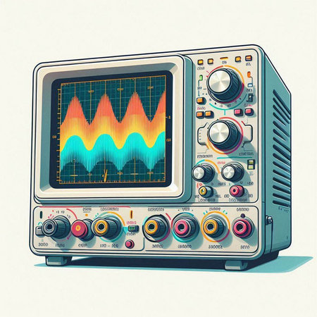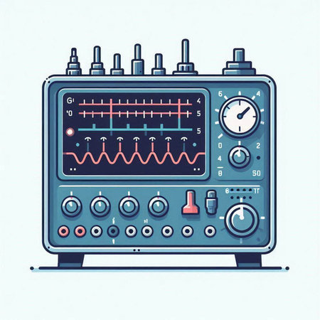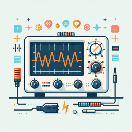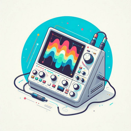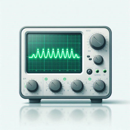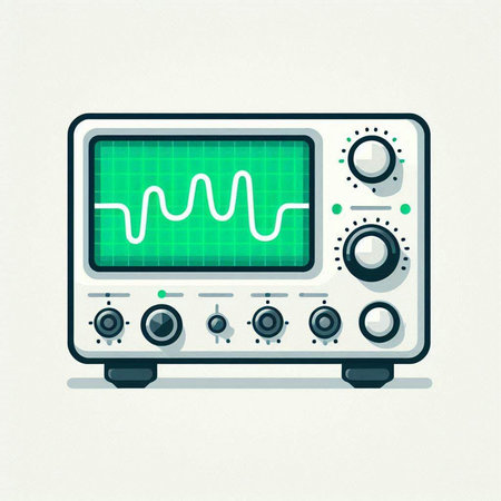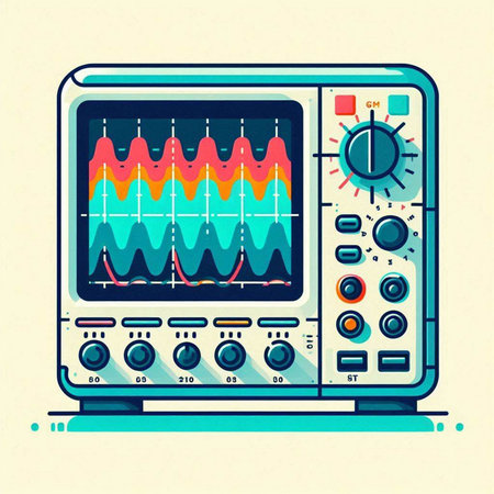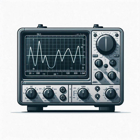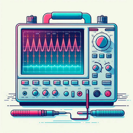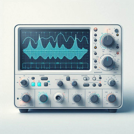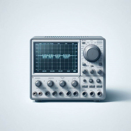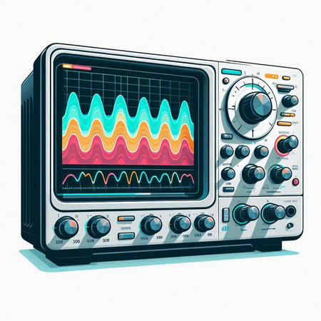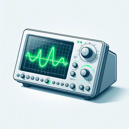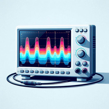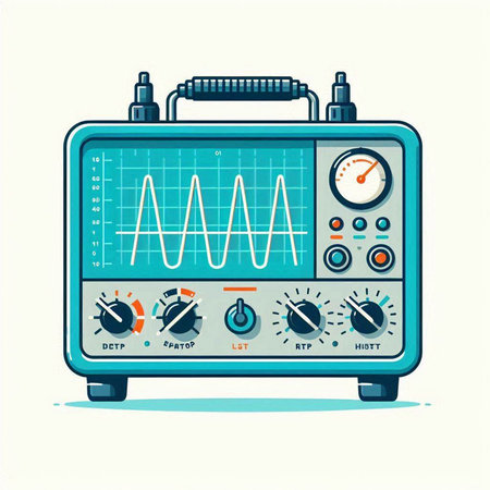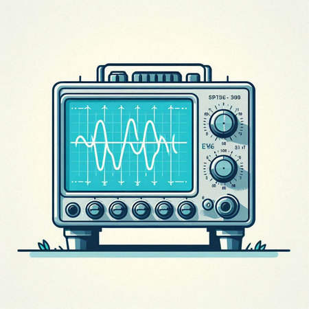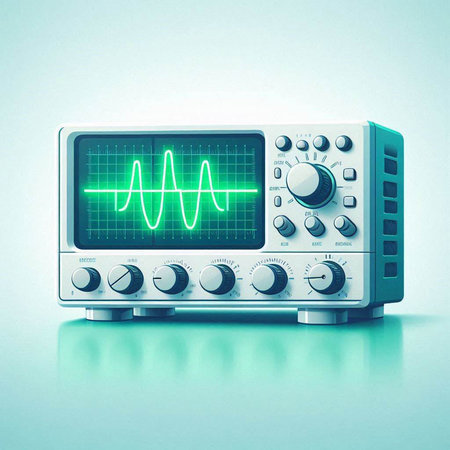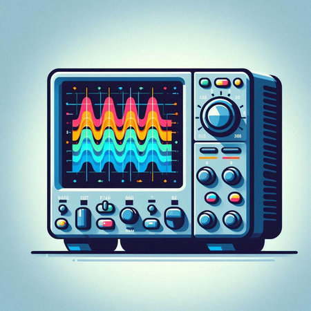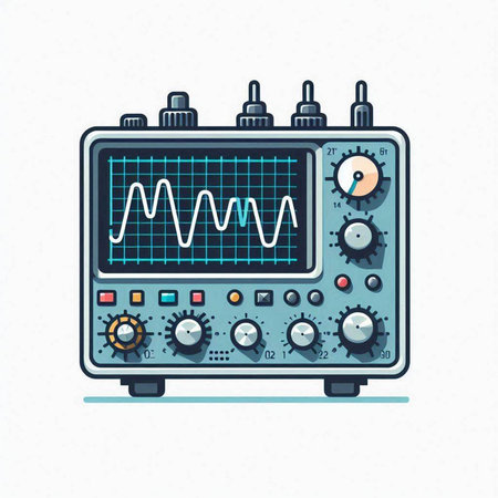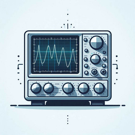 Illustration of a modern oscilloscope on a light blue background.