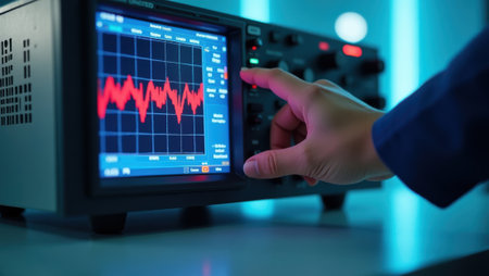 Close-up of a hand operating an oscilloscope with a red waveform on the screen, set in a modern laboratory environment with blue lighting.