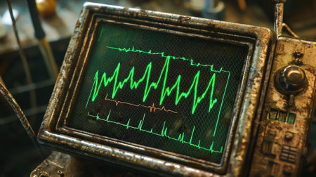 Close-up view of a vintage medical monitor showcasing waveform data, surrounded by industrial tools and equipment in a professional setting.