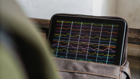 Closeup of a digital display reflecting brainwave activity with colorful graphs and dynamic waveforms indicating realtime neural responses during stimulation..