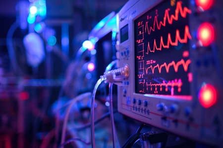 Hospital Patient Monitor Displaying Dynamic Vital Signs and Crucial Health Data in a Dimly Lit Room