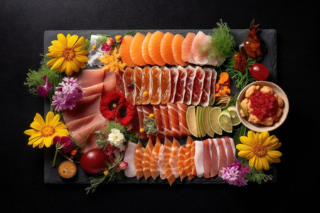 overhead shot of sushi platter on a black slate surface, created with generative ai