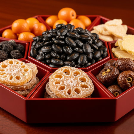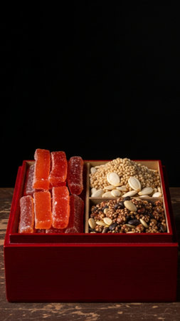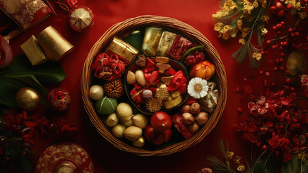 Luxurious festive food assortment in ornate red box, perfect for celebrations and gourmet dining experiences