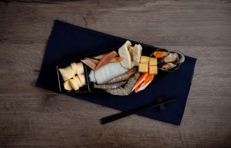 Japanese food in a box on a black background. Top view.