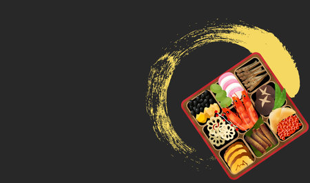 Traditional dishes for the Japan New Year / Watercolor effect / Japanese illustration of osechi cuisine / New Year's card