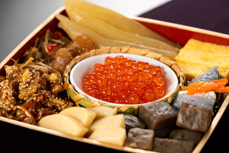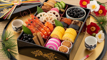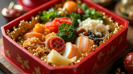 Explore the vibrant arrangement of traditional Japanese New Year food in a decorative box, showcasing a variety of flavors and textures perfect for festive celebrations.