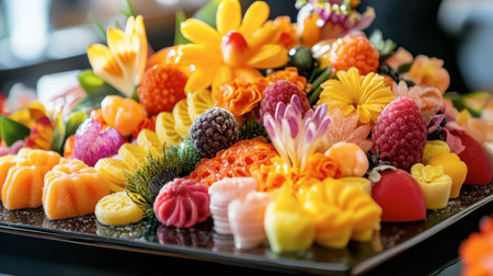 A striking arrangement of colorful sweetmeats for a special occasion, showcasing the artistry involved in their creation.