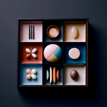 Minimalist Japanese washoku food art with precisely arranged five-color components in lacquer box, Ai created image