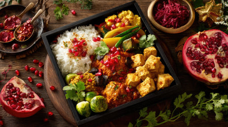 Explore a beautifully arranged Indian cuisine platter featuring rice, tofu, curry, colorful vegetables, and pomegranate, perfect for a vibrant meal.