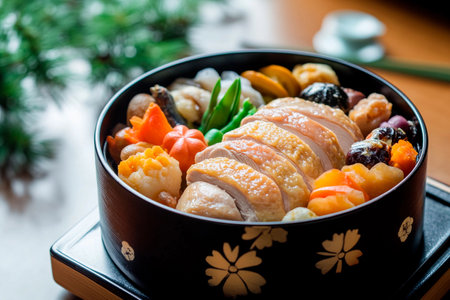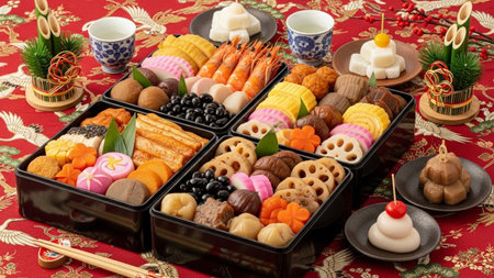 Explore the vibrant arrangement of traditional Japanese New Year food in a decorative box, showcasing a variety of flavors and textures perfect for festive celebrations.